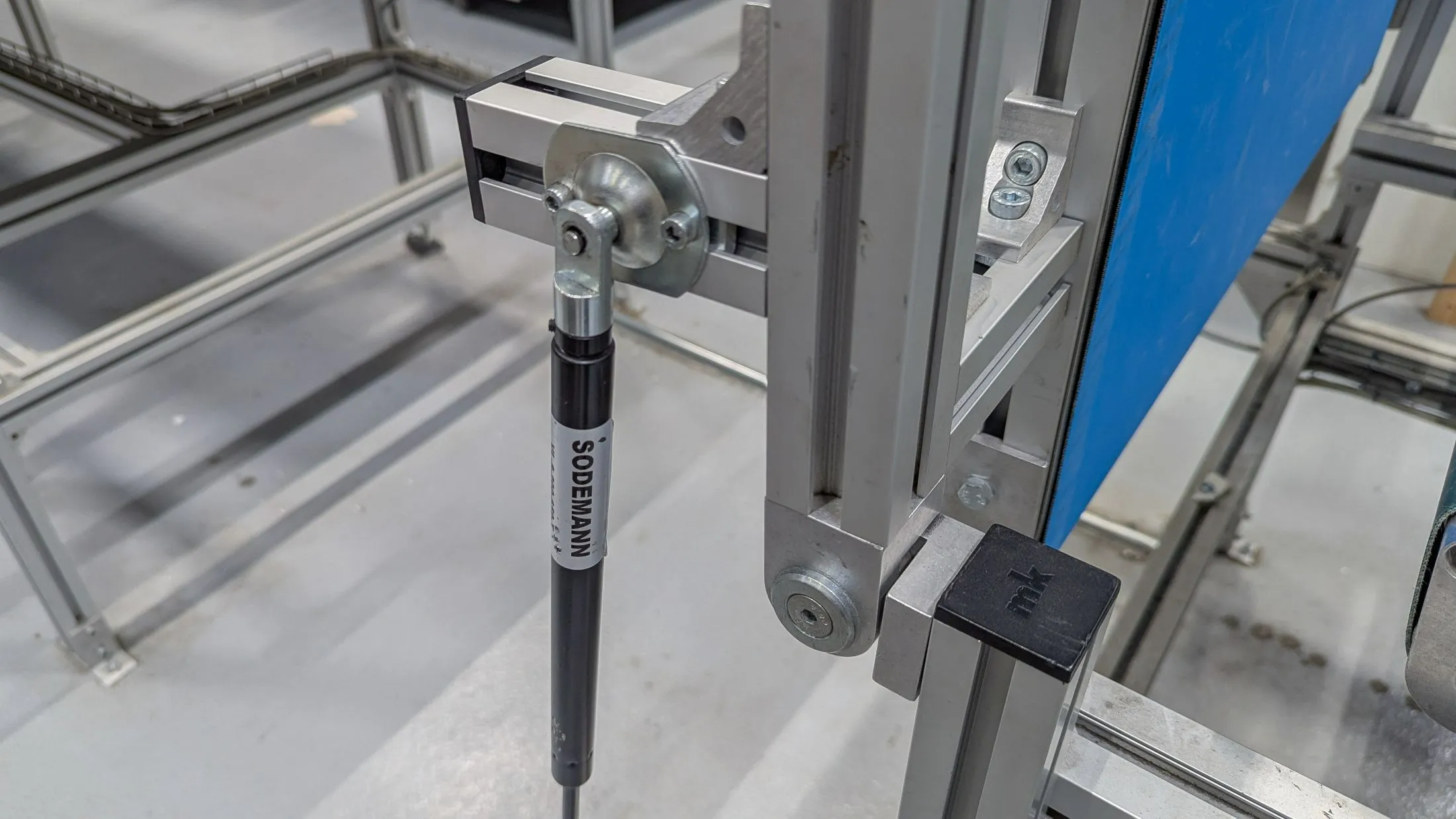 Den korta bandtransportören är utrustad med en gasfjäder som gör att den kan fungera som en stoppfunktion, d.v.s. är banan upplyft så stannar övriga transportörer.