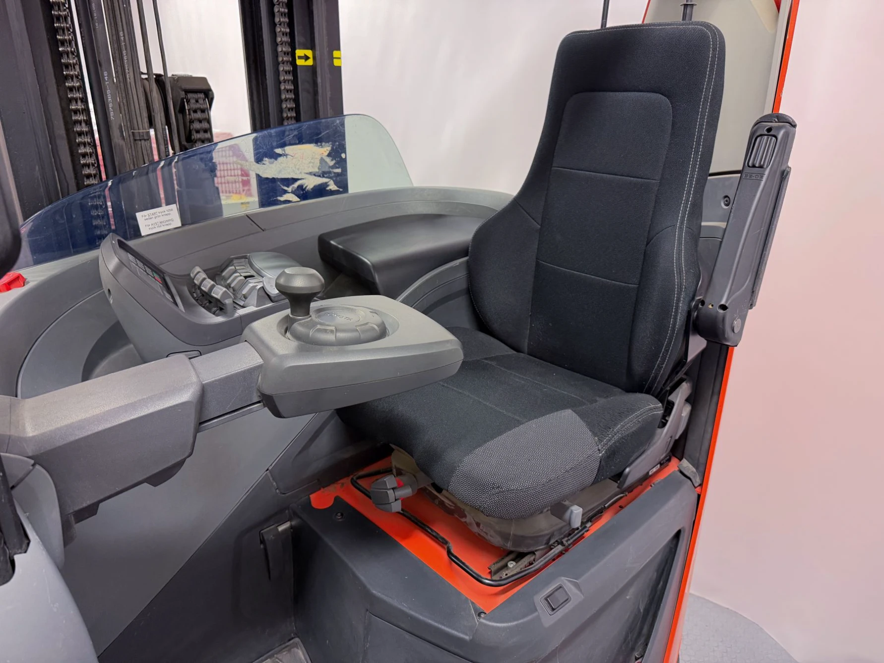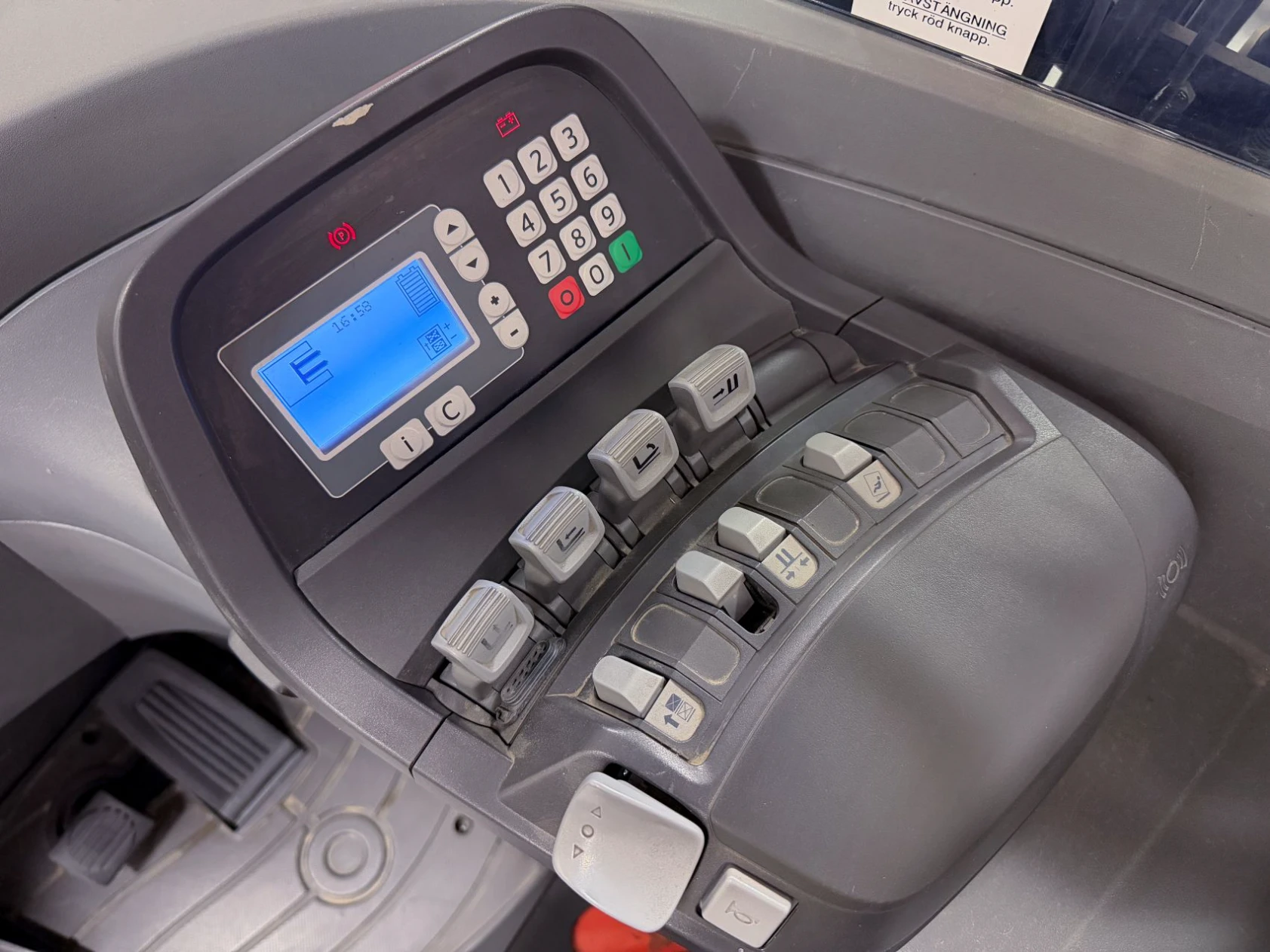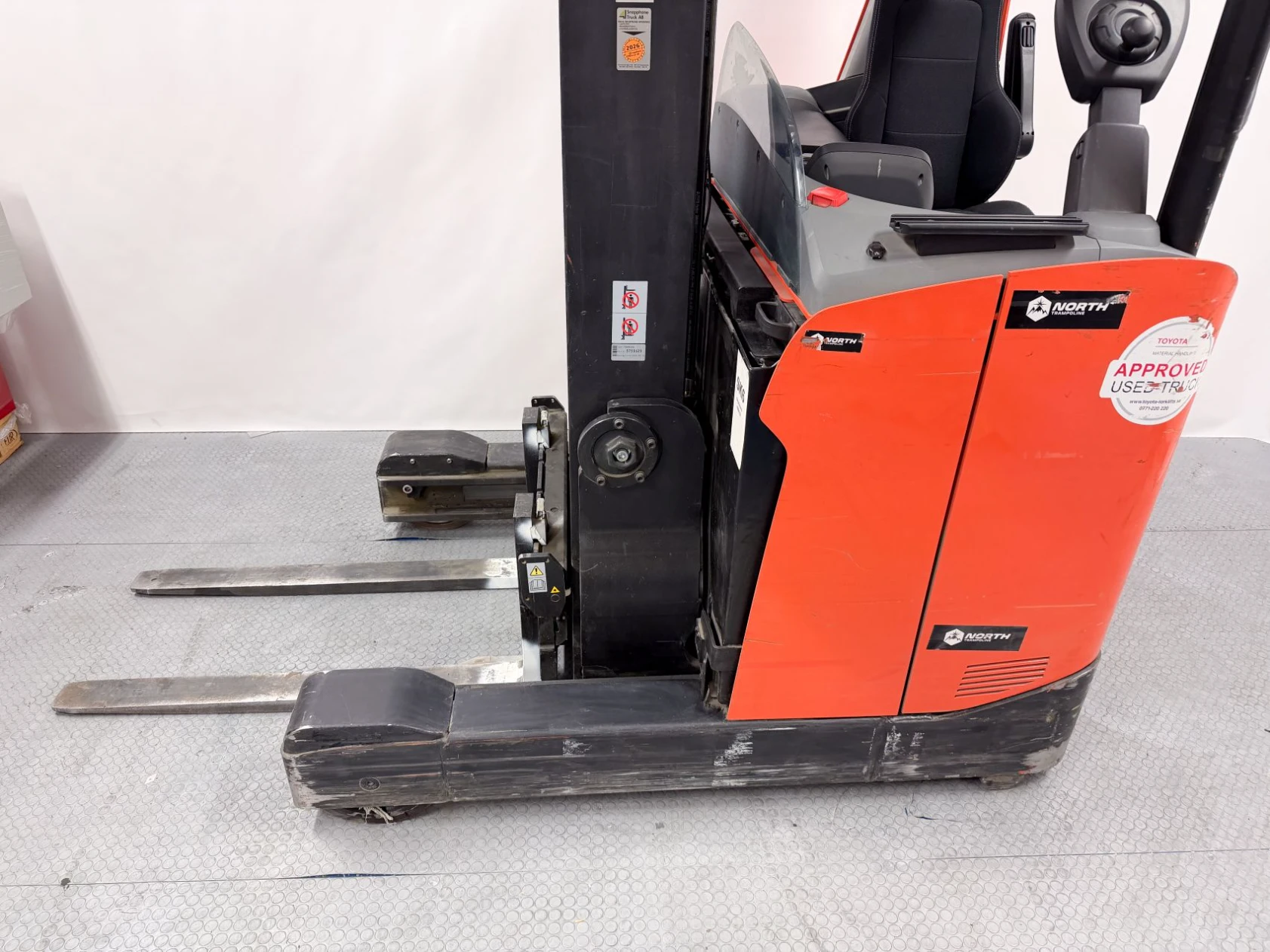 Senaste service utfördes för ett år sedan, och trucken har gått ca 450 timmar sedan dess. Kombinationen av låg gångtid, hög lyfthöjd och extrautrustning gör detta till ett mycket attraktivt val för er som söker en pålitlig och välutrustad skjutstativtruck.